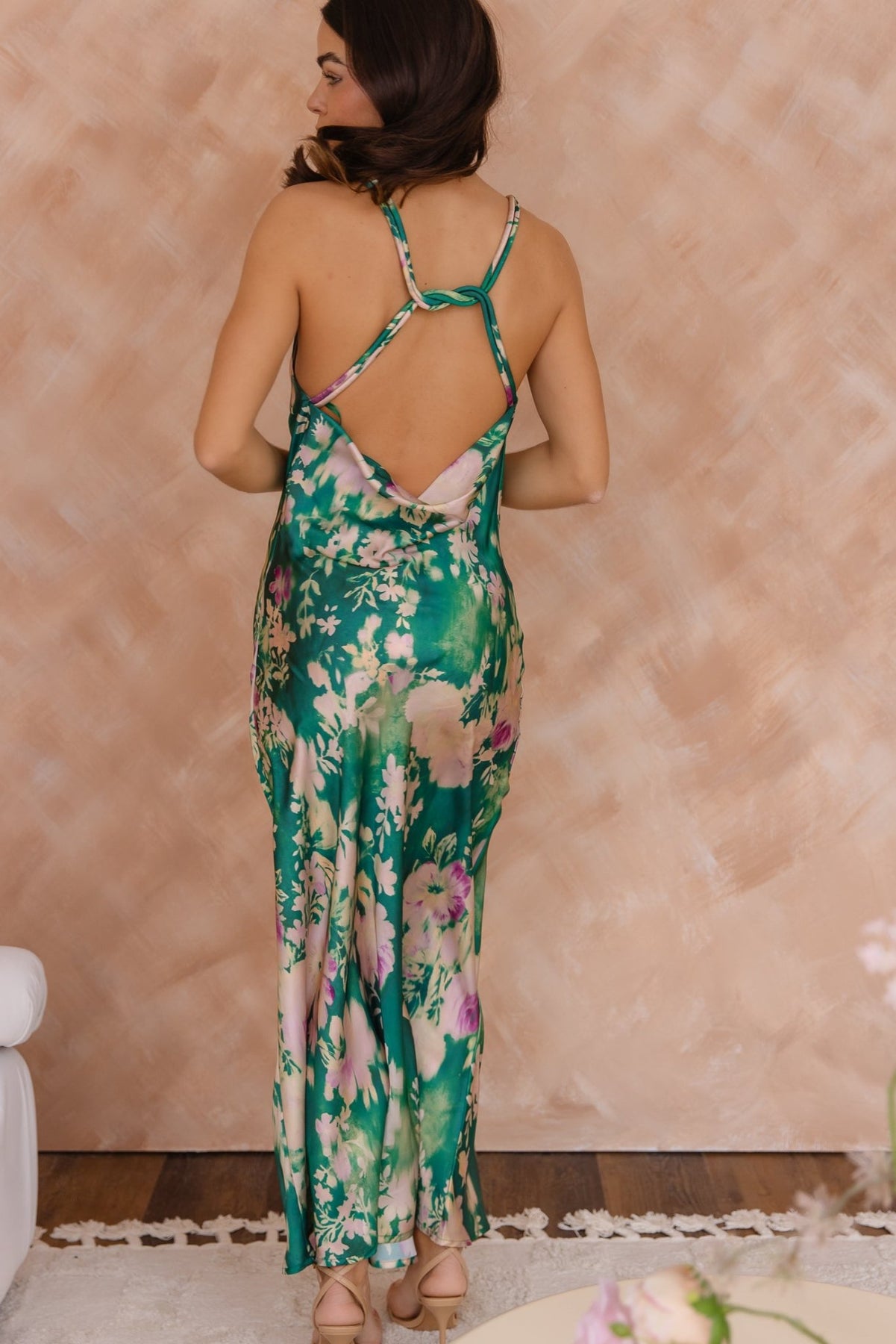 Embrace elegance with the Fern Green Garden Slip Dress. Featuring a luxurious satin finish, floral print, and intricate back details, this maxi dress is your go-to for events that call for sophistication.