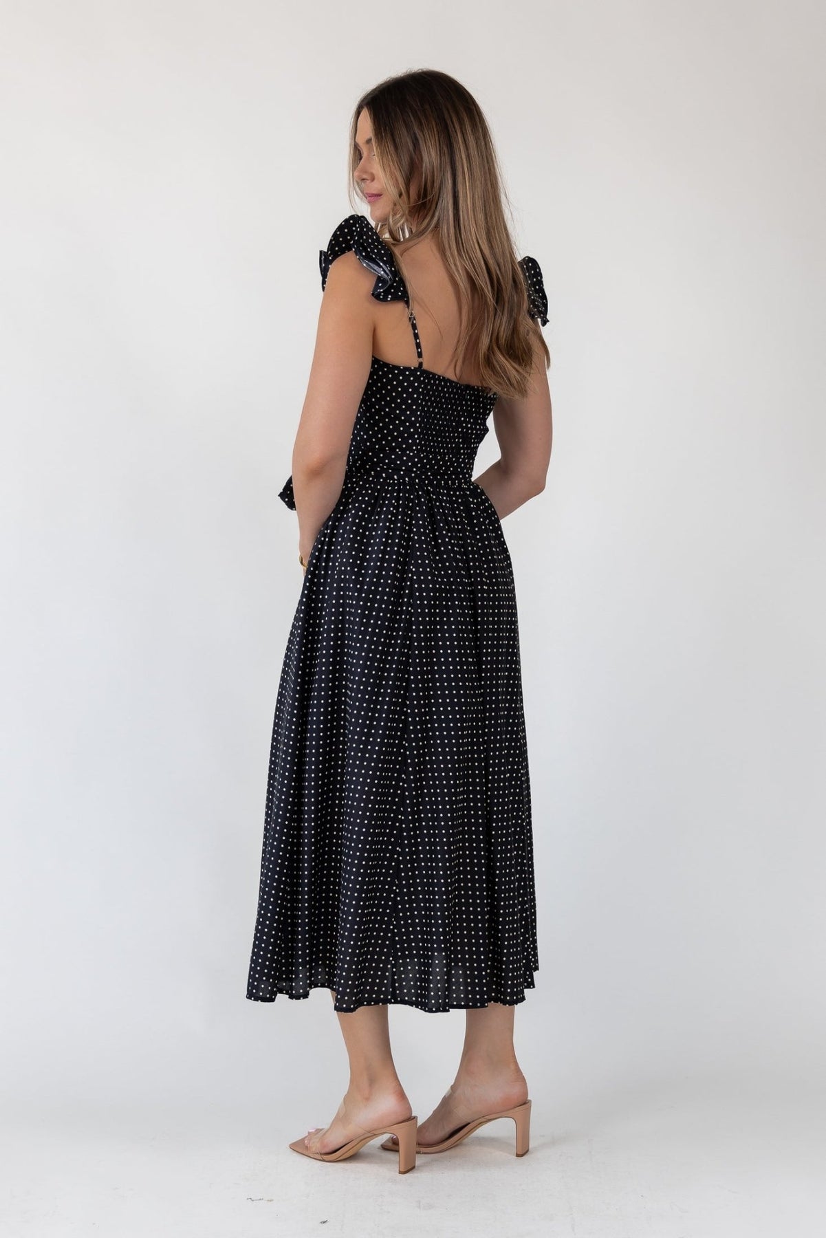 Channel timeless elegance in the Vara Black Polka Dot Corset Maxi Dress. Featuring a delicate white polka dot pattern, corset bodice, and flowing silhouette, this dress is your go-to for summer soirées.