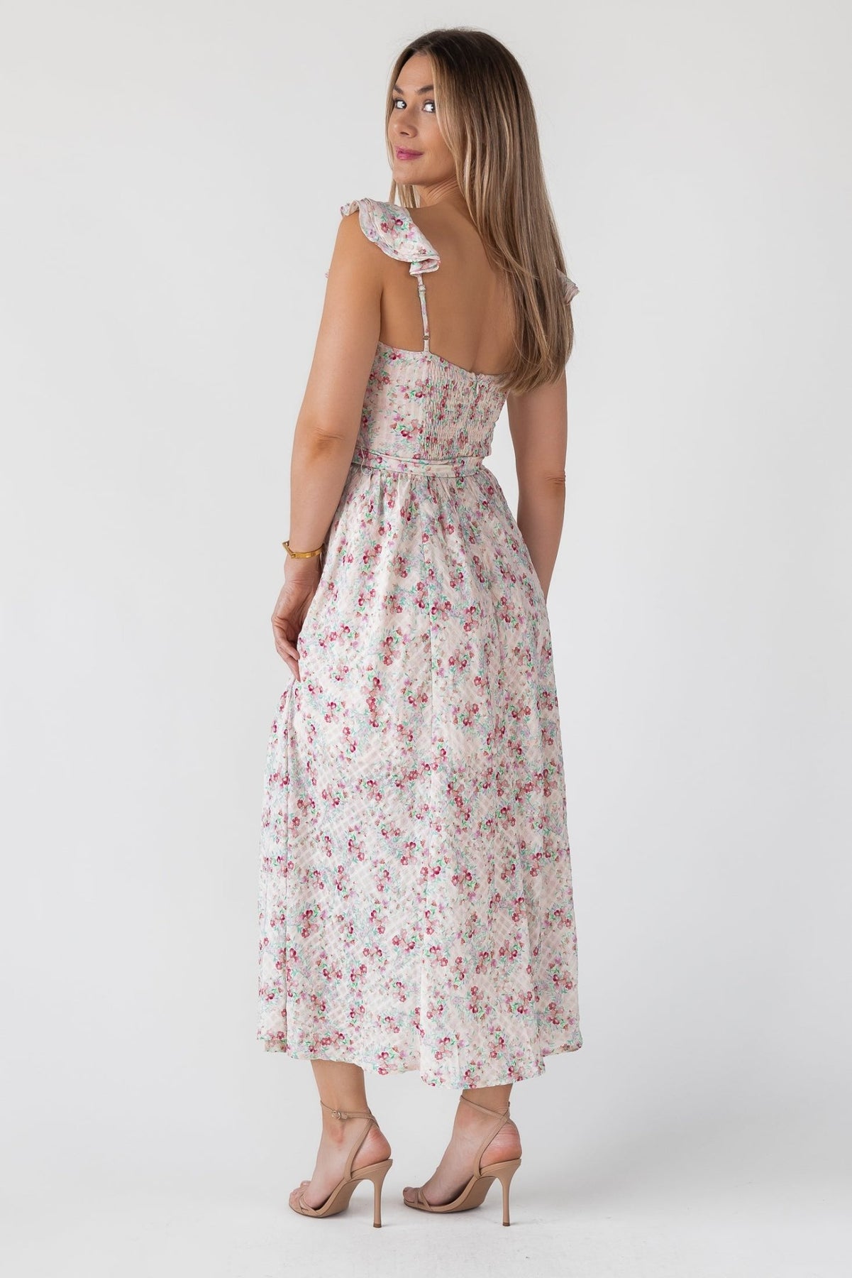 Channel timeless elegance in the Vara Blush Floral Corset Maxi Dress. Featuring a delicate blush floral print, corset bodice, and flowing silhouette, this dress is your go-to for summer soirées.