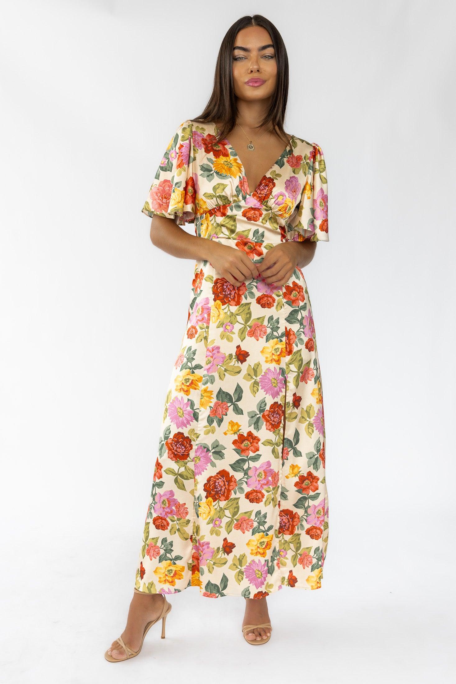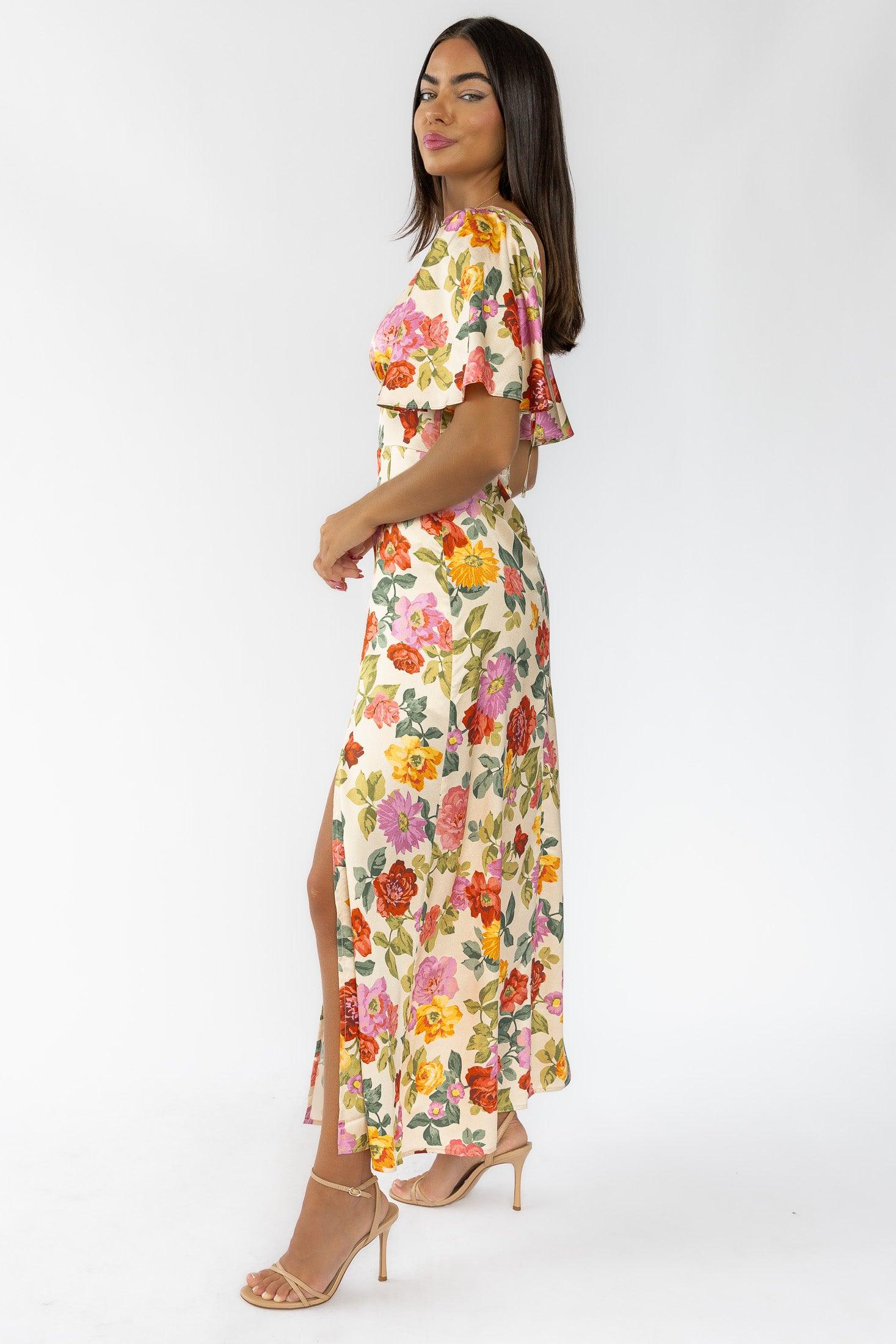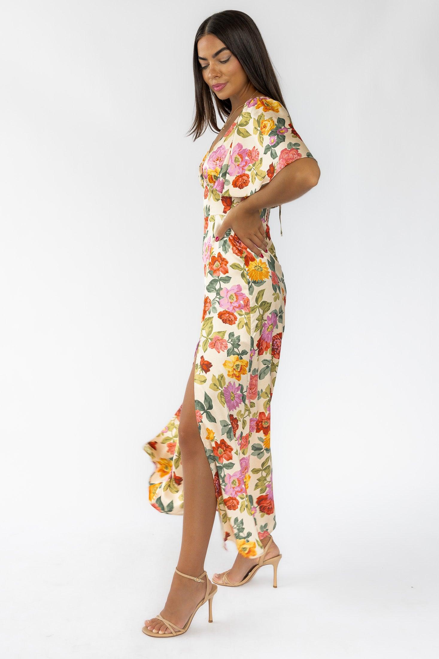 Effortless elegance with a chic twist. The Birdie Garden Floral Maxi Dress features flutter sleeves, a plunging neckline, and a flowy skirt with a side slit. Perfect for brunch or date night, it’s designed for confident, sophisticated style with a comfortable fit.