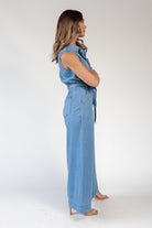 Effortless one-and-done style—this chambray jumpsuit features a flattering belted waist, utility details, and a breezy wide-leg silhouette.