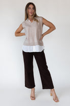 A layering essential that makes everyday styling effortless. This beige knit vest with a built-in white shirttail hem gives you the look of two pieces in one—polished, modern, and easy.