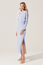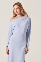 Step into effortless elegance with the Naida Off Shoulder Midi Dress. Designed with a draped bodice, long sleeves, and a sultry side slit for a sophisticated touch.