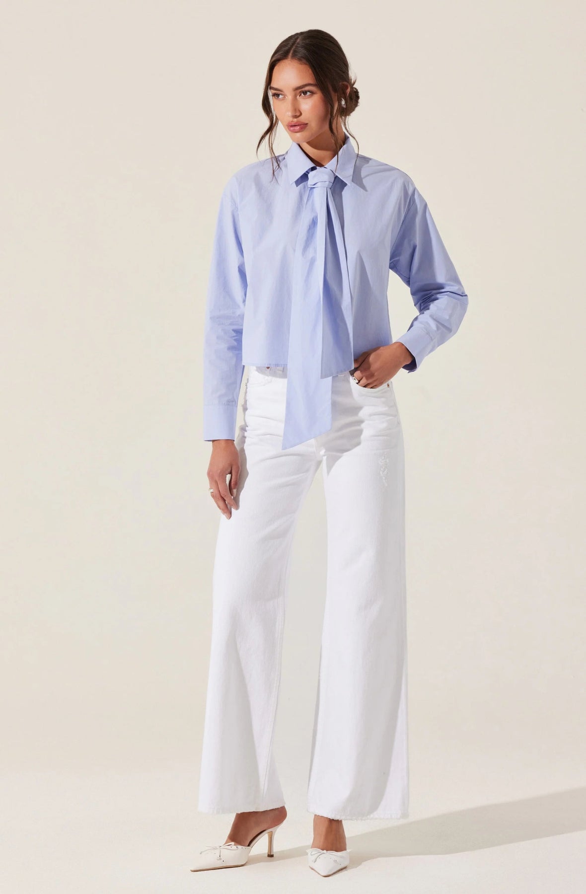 Elevate your wardrobe with the Wendi Bow Tie Blouse. Featuring a removable self-tie neck bow, crisp button-up design, and a slightly cropped fit for a modern touch.