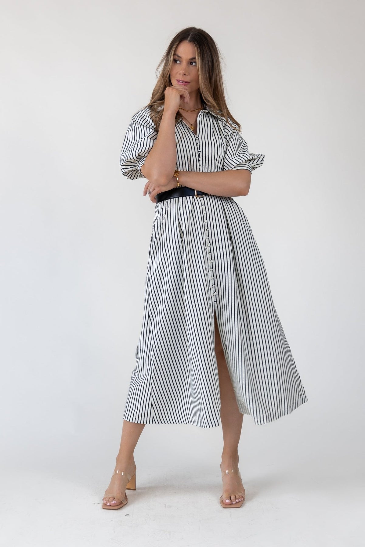 A classic stripe midi dress with a tailored waist, puff sleeves, and button-down front for a polished yet effortless look.