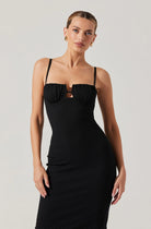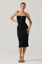 Flatter every curve in this textured knit midi with a bustier bodice, cutout detail, and bold back. Sleek, structured, and ready to turn heads.