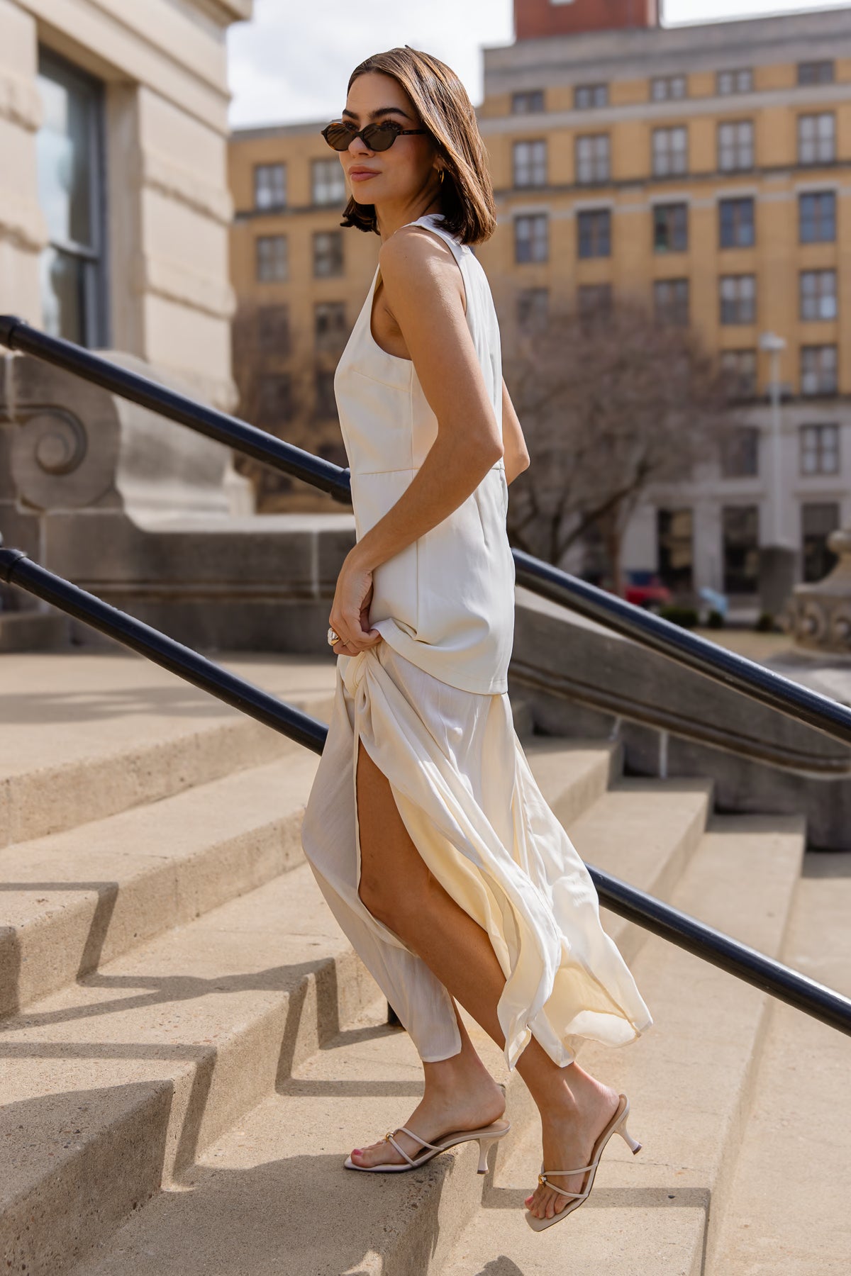 Designed with a sleeveless silhouette and tailored midi length, it creates a modern shape that feels both feminine and strong. The solid off-white hue keeps it timeless, making it perfect for showers, graduations, dinners, or any moment that calls for something elevated.