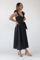 Channel timeless elegance in the Vara Black Polka Dot Corset Maxi Dress. Featuring a delicate white polka dot pattern, corset bodice, and flowing silhouette, this dress is your go-to for summer soirées.