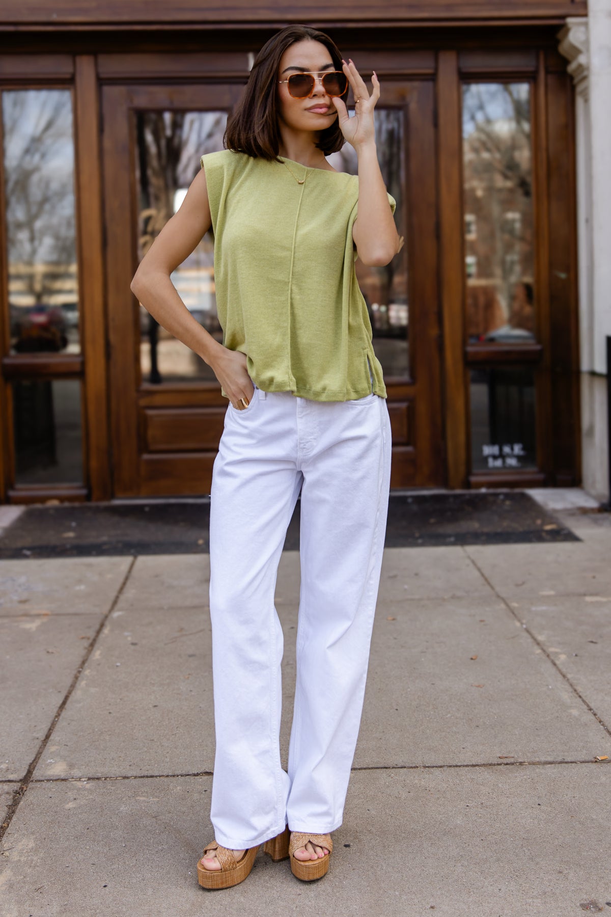 The soft, stretchy knit drapes effortlessly while stitched-in shoulder pads and a clean front seam add modern shape. Finished with a split hem for easy movement, it’s the kind of top that makes denim, trousers, or tailored shorts feel styled without extra effort.