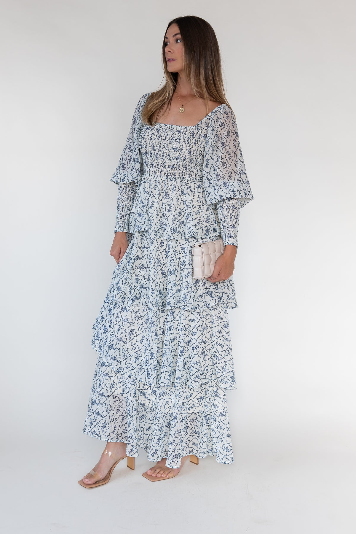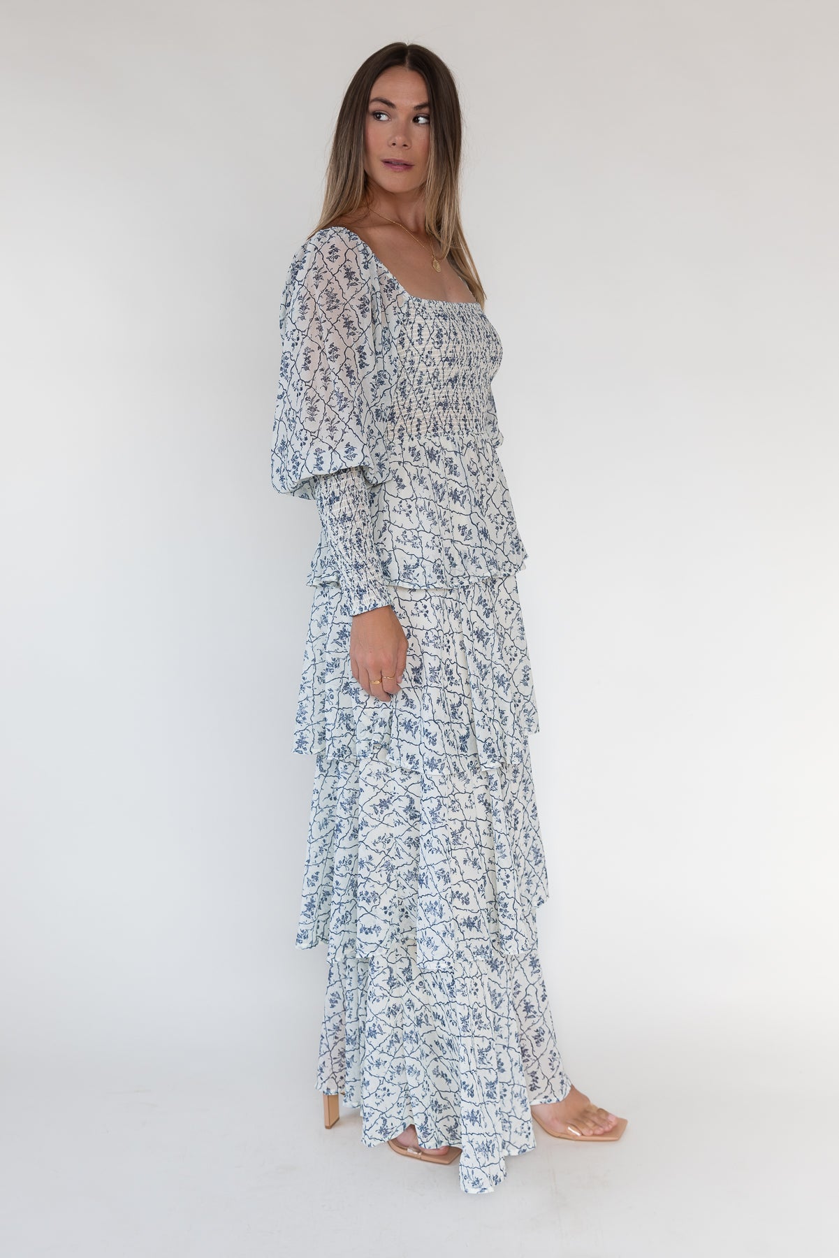 A romantic tiered maxi with timeless appeal. The Florence is designed with a flattering smocked bodice, billowy sleeves, and flowing tiers that move with ease—perfect for weddings, showers, or weekend escapes.