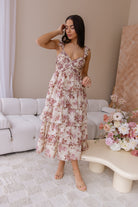 Romantic floral tiers in cream and mauve with ruffle straps and a sweetheart neckline—perfect for weddings and elegant gatherings.