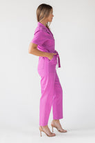 Step into effortless style with the Kendall Pink Washed Denim Jumpsuit. Featuring a collared neckline, stretchy tie-waist, and tapered leg, it's your versatile go-to for any occasion.