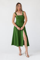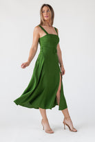Step into effortless sophistication with our Green Linen Belted Midi Dress. Designed with a timeless A-line silhouette, a high side slit, and a chic circle buckle belt, it's your go-to piece for refined yet relaxed styling.