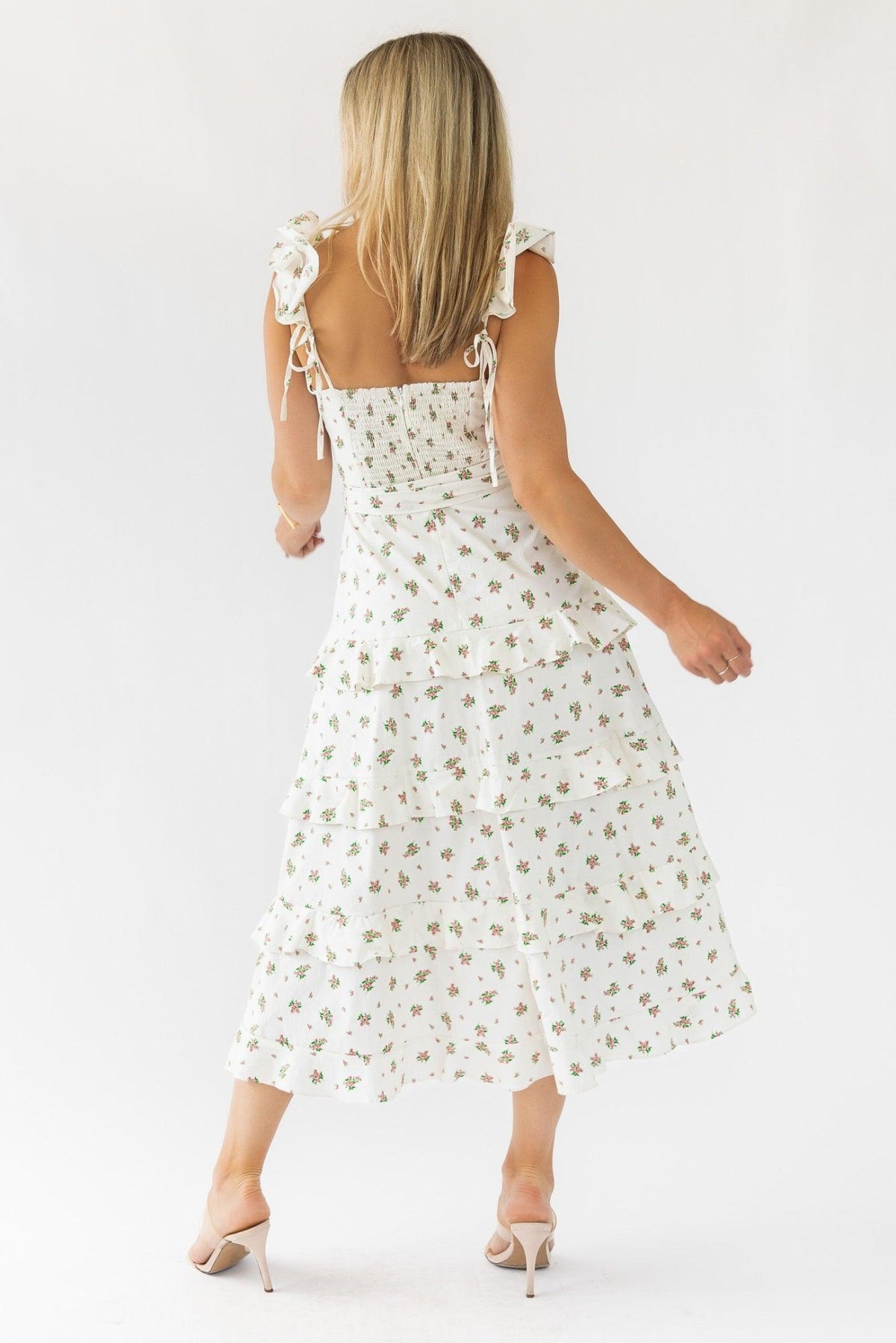 Step into a world of elegance with our Luciana Cream Floral Midi Dress. Featuring a delicate floral pattern, ruffle shoulder straps, and a flattering smocked back detail, this dress is perfect for garden parties and summer soirees.