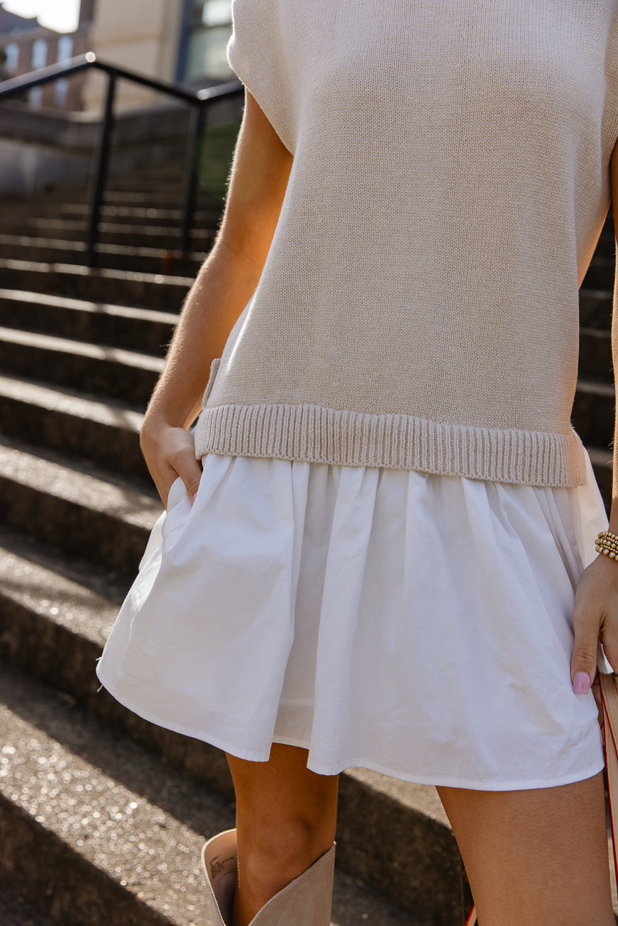 Penelope is one of those pieces that makes getting dressed feel decided. A soft knit on top. A crisp poplin skirt below. That layered look — without the bulk. Easy for daytime, polished enough for dinner.