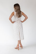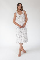 This vintage-inspired midi dress pairs a tailored vest bodice with a flowy skirt, finished in a charming floral print for warm-weather ease.