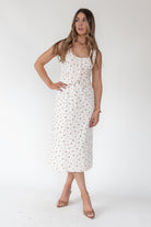 This vintage-inspired midi dress pairs a tailored vest bodice with a flowy skirt, finished in a charming floral print for warm-weather ease.