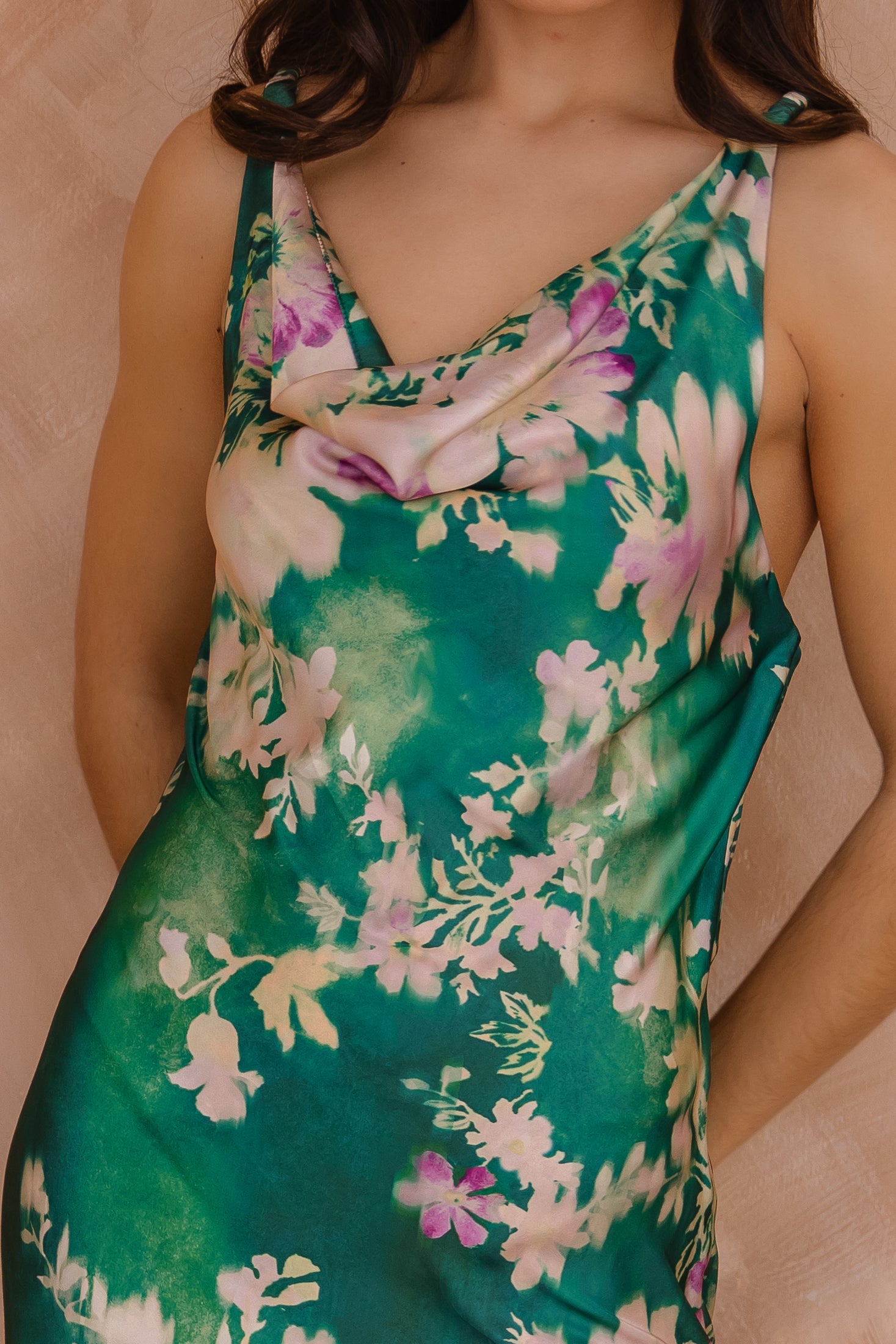 Embrace elegance with the Fern Green Garden Slip Dress. Featuring a luxurious satin finish, floral print, and intricate back details, this maxi dress is your go-to for events that call for sophistication.