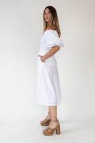 A breezy linen midi with puff sleeves and pockets—perfect for warm days, sunset strolls, and weekend wine dates.