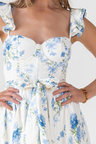 Channel timeless elegance in the Vara Blue Floral Linen Blend Corset Maxi Dress. Featuring a delicate blue floral print, corset bodice, and flowing silhouette, this dress is your go-to for summer soirées.