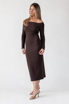 Embrace understated elegance with this off-shoulder midi dress. The chic fold-over detail and sultry side slit make it perfect for date nights or special occasions.