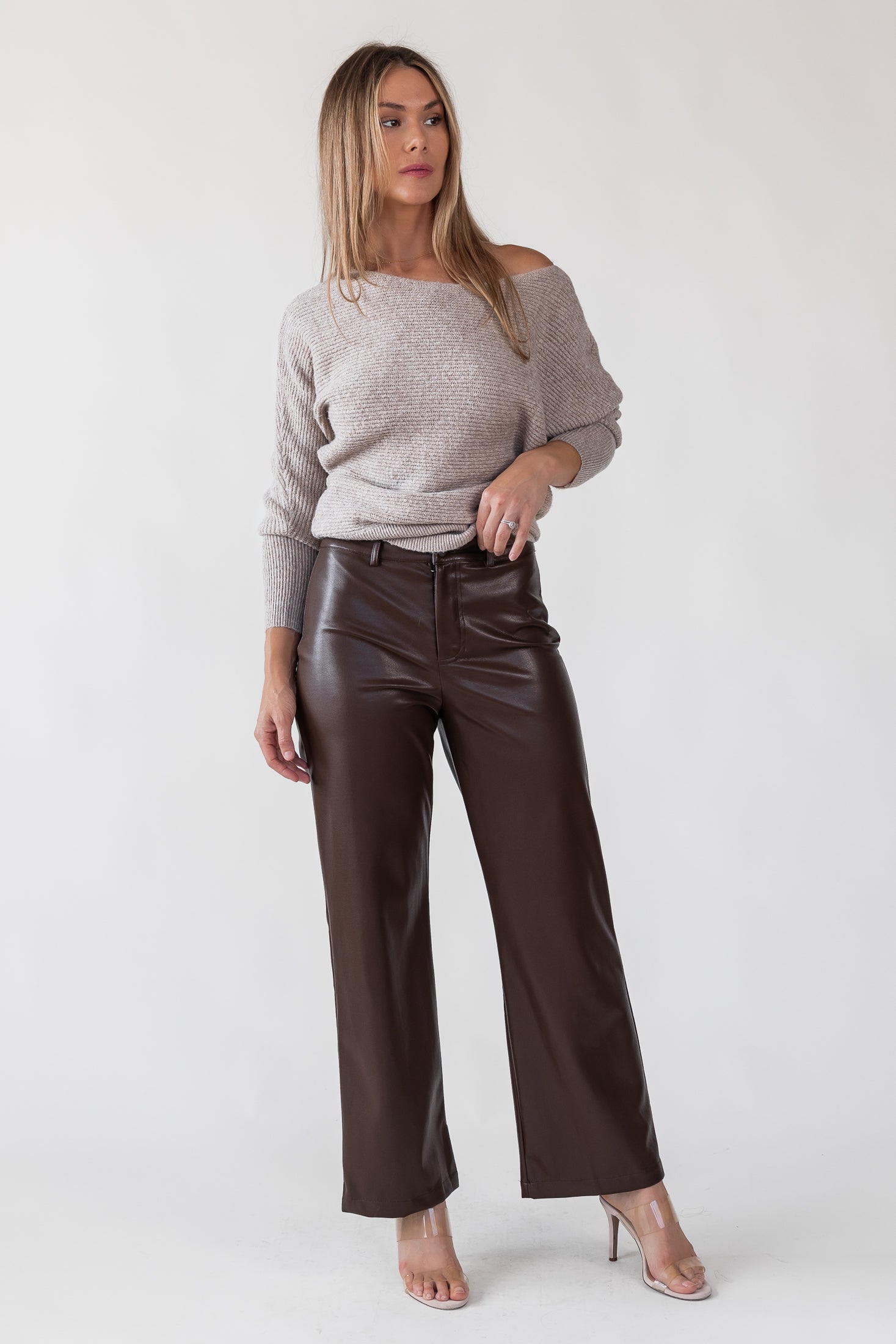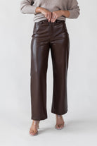 Elevate your wardrobe with the Phebe Brown Faux Leather Pants. Featuring a cropped wide-leg design, stretchy faux leather, and classic mid-rise fit, these pants are a chic addition to your collection.