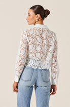 A chic floral lace button-up with a cropped fit, scalloped hem, and contrast collar. The perfect blend of sophistication and edge.
