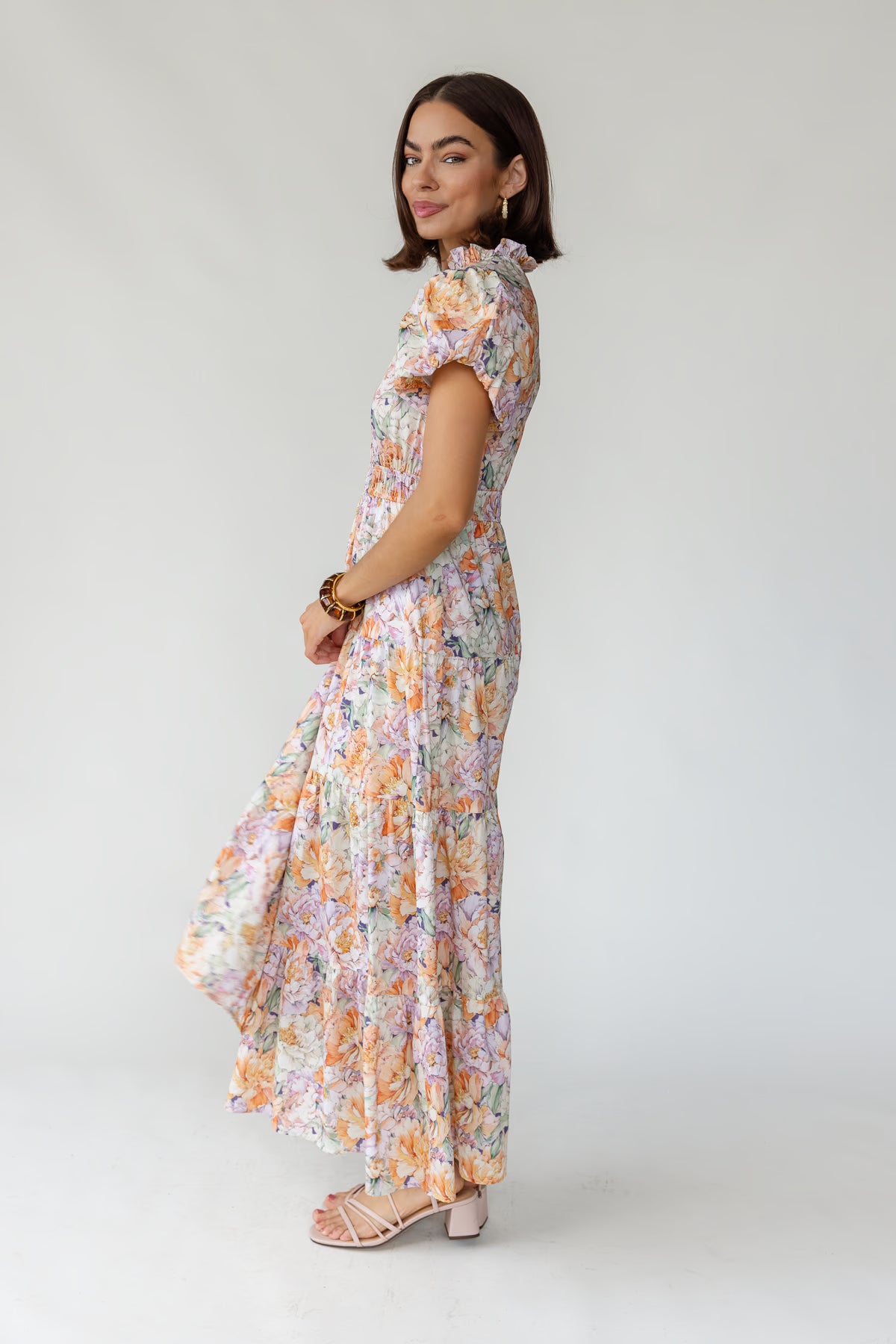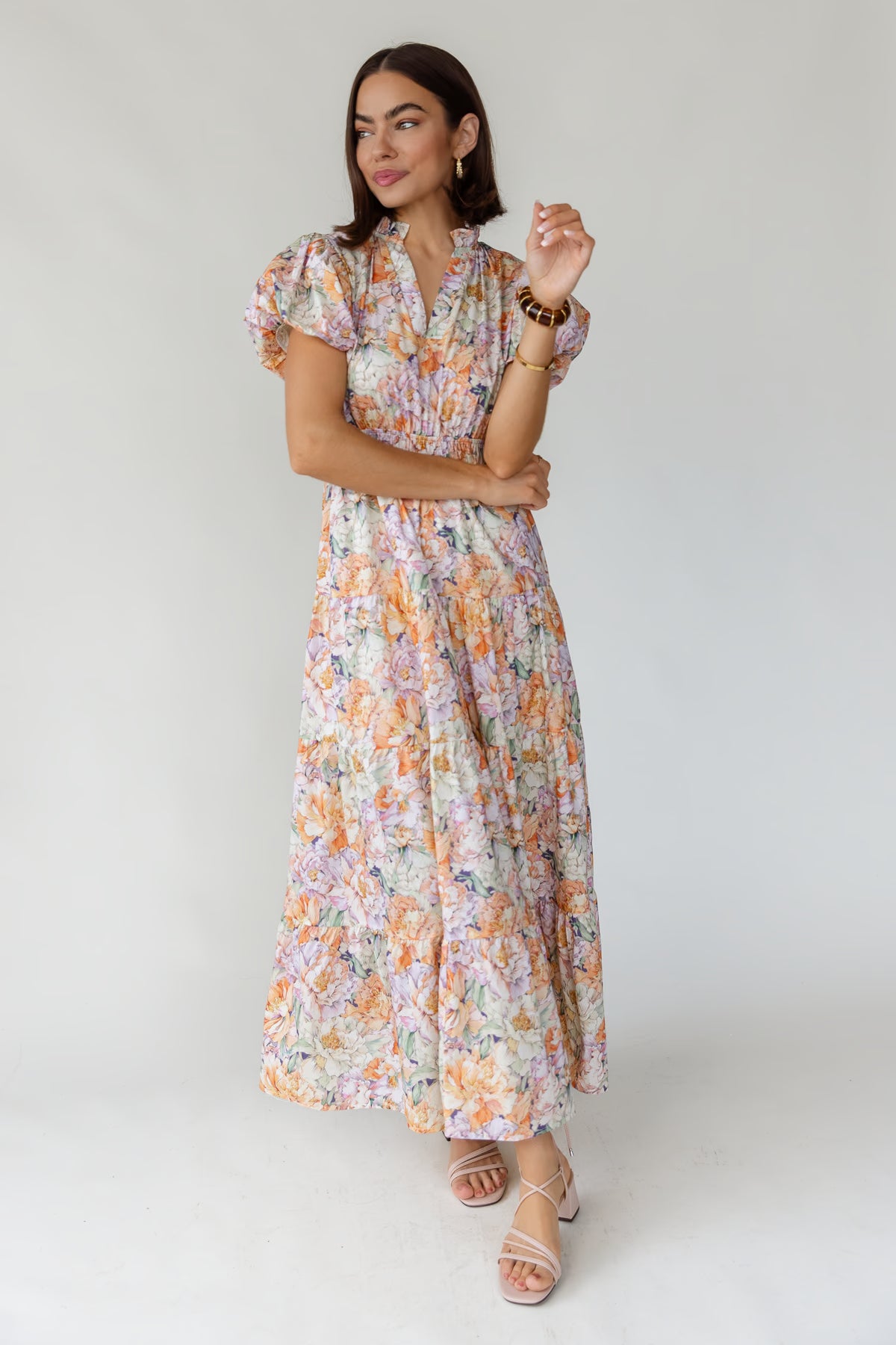 Short puff sleeves and a flattering V-neckline frame the bodice, while the smocked waistband creates shape without sacrificing comfort. Finished with a tiered maxi skirt that moves beautifully, it’s the kind of dress you’ll reach for again and again — from brunch to summer gatherings.