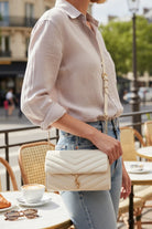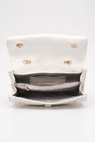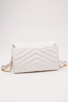 The Nanci Crossbody in Oatmilk features a stylish quilted vegan leather design with gold hardware and a secure clip closure. Inside, it offers organized storage with a zip pocket and two compartments, perfect for keeping essentials safe and accessible. Compact and chic, it measures 8.5” L x 3” W x 5.3” H.
